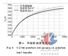 由图5可以看出,在减振器其他参数确定后,当活塞杆直径为0.02 m时,循环末端油液温度为394 K;活塞杆直径为0.026 m时,循环末端油液温度为387 K。即随着活塞杆径向尺寸的增大,油液在相同时间内的温升逐渐减小。图6为热辐射油液温度的对比图。由图6可以看出,不考虑热辐射时,循环末端减振器油液温度为387 K;在把外筒壁面喷涂成深色后,发射率逐渐增大,这时就需要考虑热辐射的换热量。当发射率为0.5时,循环末端油液温度为380 K;当发射率为0.97时,类似于黑体辐射,循环末端油液温度为377 K。即随着缸体发射率的增大,油液温度在相同时间内的温升逐渐减小。