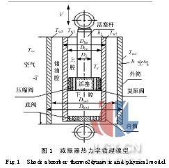 目前,车辆上广泛应用的双筒式液压减振器工艺简单、成本低廉,但散热困难。因为它主要通过阻尼阀对油液节流产生阻尼力衰减车身振动,所消耗掉的振动能量将转换成为热能,使缸体温度不断升高。当缸体温度达到并超过密封件所能承受的极限温度后很容易导致油液的泄漏。虽然减振装置的散热能力对系统可靠性影响很大,但由于涉及不少跨学科专业知识,所以国内还没有展开相关的研究工作,国外公开出版的文献也甚少。基于这种情况,本文对双筒式减振器的热力学模型进行了系统研究。