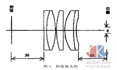 转接镜用五片三组广角目镜构成,它将显微物镜所成的像成像在无限远处,数码相机将无限远处的像成在1/2英寸的CCD靶面上。光路如图3所示,显微物镜的出射光瞳(也是转接镜的入射光瞳)它距转接镜的物面(也是显微镜的像面)为160cm;对数码相机入瞳位置粗略地测试,结果表明:在f=6.5mm时,入瞳在镜内约28mm(随着焦距增大,入瞳位置在镜内深度也增加),考虑到接口位置和安装位置需要等,转接镜的出瞳位置取33mm;由于转接镜头是插入目镜筒中的,因此,转接镜的物方焦点位置需大于36mm。如图1,为转接镜头的结构。