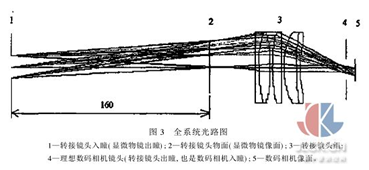 如图3,显微物镜将观察对象成像在位置2,这也是转接镜的物面,转接镜将位置2的物面成像在无限远处,数码相机将无限远处的像成在位置5上。显微镜的出瞳也是转接镜头的入瞳,转接镜头的出瞳也是数码相机的入瞳。