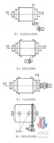 由于各行业用途及其工艺要求的不同, 所使用的球磨机品种类型也不尽相同。 矿山选矿厂、水泥厂、化工厂等行业使用的球磨机为连续进出料类型。 该类型又分为周边齿轮传动型(见图 1)、胶轮传动型(即托辗式见图 2)、中心传动型(见图 3)等类型;轻工业用于凉席竹片打磨,陶瓷厂用于长石、石英、泥料湿法间歇细磨等所使用的球磨机为间歇进出料类型。 即球磨机一次性装料粉磨完成后须停机卸料再重新装料启动运行。 此类型多为周边皮带传动型(见图 4)。 在此还要特别提到钢铁厂烧结车间使用的原料圆筒混合机, 无论是设备结构还是工作原理都与周边齿轮传动连续进出料类型的球磨机十分相似,故并此讨论。