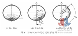 我们以间歇进出料型球磨机为例分析球磨机启动过程:在重新装料后,密度较大的钢球集中置于转筒下层,待粉磨原料覆盖其上,湿式球磨机内还注有液体,转筒内填充物的重心偏离转筒旋转轴线距离 r0(见图5a)。 在球磨机启动之初,电动机除要克服传动系统摩擦阻力矩 Mf、对大惯量加速的阻力矩 Mr外,还必须克服填充物因重力形成的偏心力矩 Mr(见图 5b)。 偏心力矩Mf起初是按正弦函数关系变化,最大值为 mgr0,直至进入球磨机稳定运行工况后转变为恒定值, 随着原料钢球互混并作抛落运动, 其平均重心的位置与距旋转轴线的距离比较静态均发生了改变(见图 5c)。 球磨机启动时的阻力矩可表示如下: