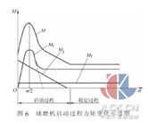 (2)不合理地对电动机采用降压启动方式。 由图 6可知, 球磨机启动过程最大力矩是在转筒转动约 1/4转, 也就是偶合器涡轮转动 I/4 (I 为传动系统总减速比)附近而非在 nT=0 处;而从前面液力偶合器匹配适当的球磨机启动过程分析可知,电动机是利用偶合器主、从动轮间无刚性联接, 从动端负载滞后传递于主动端而实现空载或小负荷条件下迅速启动, 进入稳定运行工况并利用其峰值力矩驱动负载完成启动过程的,因而此过程中要求电动机自身的启动是一次性连贯完成,也就是要求其采取全压启动方式。 目前有很多用户出于减少对电网冲击的考虑而教条地对电动机采取降压启动方式, 并且在降压启动切换至全压启动运行之间设有几秒至十几秒钟的停顿, 殊不知这适得其反增加了球磨机的启动难度甚至无法启动并可能造成元件故障。 我们知道在降压启动(如星形―三角形启动)时电动的输出扭矩(或功率)只有全压启动方式的 1/3,这是无法驱动球磨机转筒越过最大扭矩点的, 而只是使转筒转动了一个角度便使偶合器处于堵转发热状态。 在电动机由降压启动切换至全压启动运行的停顿时间里转筒在偏心重力作用下开始反转并带动偶合器涡轮反转, 若此时电动机切入到全压启动则因偶合器进入反转工况使驱动力矩下降 (见液力偶合器全特性章节),需经过一段时间待偶合器返回牵引工况后对球磨机的启动才重新开始。 在此时间内偶合器同时由主、从动端吸收能量而温度急剧上升可能引发高温喷液并极易造成密封件老化损坏。 鉴此,我们建议配有液力偶合器的球磨机采取全压启动方式, 如果一定要采用降压启动方式则在电器切换过程中不得有使转筒反转的停顿时间。 实践证明全压启动方式不仅可行,还可降低设备成本, 如某建材机械厂在其产品斗式提升机上引入应用液力偶合器后, 便取消进口价值 5 万余元的降压启动控制系统而改用全压启动方式, 仅此一项便节约了近十倍于液力偶合器价格的成本, 并减少了电器故障率、技术经济效益十分明显。