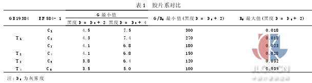 射线透过工件后发生的强度变化对人眼是不可见的,在射线照相检测中需要使用胶片产生不同程度的曝光,然后进行暗室处理,形成可以判读的底片,所以胶片质量对底片影像有重大影响。JB/T4730吸收了国外的先进理念,使用了胶片系的概念。胶片系是指胶片、增感屏、暗室处理的药品和程序(方法)结合在一起作为一个整体。根据GB/T19348.1(与ISO 11699等效)将胶片系统按照梯度、颗粒度和梯度/颗粒度划分为T1到T4共4类[5],T1最好,T4最差,见表1。这相对于旧版本中的定性规定有了很大的改进。RCC-M使用了同样的胶片系的概念,它依据EN584将胶片分为C1~C6共6类[6]。由表1可以看出,T1-T4分别对应于C2、C4、C5和C6。JB/T4730规定A级和AB级射线检测应采用不低于T3的胶片,B级应采用不低于T2的胶片。当采用射线对裂纹敏感性大的材料进行检测时,应采用不低于T2的胶片。