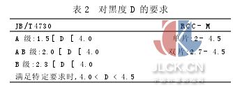 JB/T4730和RCC-M对于黑度的规定见表2。RCC-M的单片与JB/T4730的AB级相当,高于A级而低于B级。但是当采用双片技术时,则高于JB/T4730的各个级别要求。