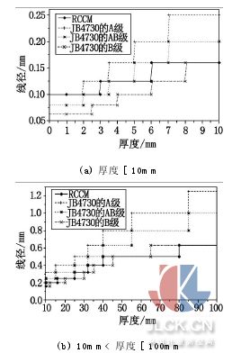(6)在底片像质计灵敏度要求上,总体上RCC-M较JB/T4730的A级和AB级要高,但是在厚度3.5mm时,小于AB级的要求。与JB/T4730的B级相比,除在65mm~80mm厚度范围外,与后者相同或低于后者。