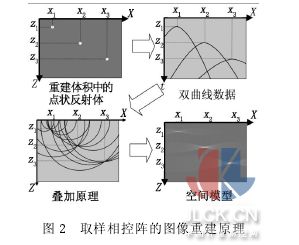 常规相控阵技术(CPA)是通过电子发收延迟控制,来使声束变角转向的,而取样相控阵技术(SPA)则利用基波合成法来重建扇形图像。这样,通过发射一次脉冲,可以重建包含各种入射角的扇形图像,此过程利用了基尔霍夫偏移算法(Kirchhoff migra2tion algorithm)。因此,合成聚焦可存在于每个成像点(见图1)。