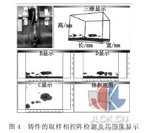图4表示用取样相控阵技术对大型铸件进行超声检测的结果。用普通单直探头脉冲回波DGS(距离-增益-大小)法,测出的缺陷当量尺寸为��3.5 mm平底孔;而用取样相控阵法,测出的实际缺陷尺寸约为80mm×40mm×30mm,与金相分析结果一致。可见两者差别很大。使用取样相控阵检测被检工件,通过三维层析图像的重建,可对检测结果进行接近实际的定量评价。已经推出的便携式取样相控阵检测仪,由双轴操纵器、相控阵换能器和UT电子设备组成。相控阵探头进行扫查时,评价系统(主机)能实时显示三维图像。相控阵检测仪不管是进行一次性的便携式服务,还是作为日常使用的检测设备,都能为用户提供材料缺陷的快速分析。