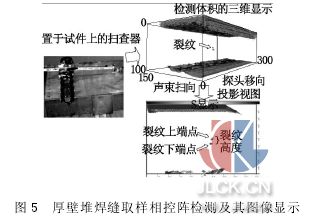 承压设备在用检测,材料缺陷的准确定量,而后进行有依据的安全评价,可延长设备使用寿命。取样相控阵法最适合于与安全有关的承压部件的正确分析。图5即表示有缺陷堆焊试件用取样相控阵法的检测结果。扫查是用2MHz相控阵换能器从试件堆焊侧进行的(慢扫查)。探头沿声束扫查方向步进间距1mm,探头横向移动步进间距3mm。从B显示图上,可分辨出裂纹的上下端点。由此可准确测出裂纹在被检工件中的位置和高度、长度尺寸。