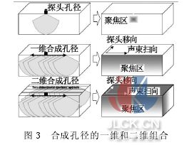 合成孔径的累积可令检测体积的某一平面上聚焦区域增大(图3)。与经典的SAFT图像重建法不同,取样相控阵法叠加的不是单一时间信号(即A扫描显示),而是两维扇形图像,将两维孔径一一累加,就可进行切片层析照相,从而提高三维空间分辨率。阵元长度减小的专用相控阵换能器,因在探头移动方向有较大的声束扩散角,因而可改善检测结果。