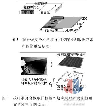 图7表示用取样相控阵水浸法检测设有人工缺陷的碳纤维合成材料试板的检测结果。由IZFP(德国无损检测研究所)研制的"三维聚焦"法,不仅能快速重建图像,还能进行多项操作,如对图像显示进行定位、定量,也能实施一些预操作步骤(如旋转、变焦),以及实时改变显示视图等。