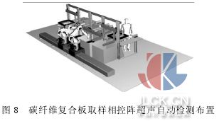 由于现代碳纤维复合材料的生产速度较高,亟需使用取样相控阵的自动超声检测设备,以能配合生产进行快速可靠检测,图8即为用取样相控阵对碳纤维复合材料进行超声自动检测的设备布置示例图。
