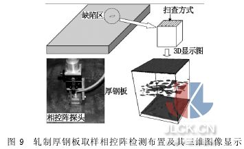 经典的SAFT法可延用于取样相控阵技术,能大大提高检测速度。图9即表示含有自然缺陷的轧制厚钢板,用取样相控阵超声技术的检测布置和检测结果的三维图像显示。