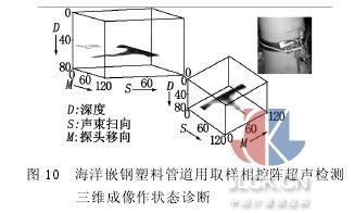 图10表示用取样相控阵技术对海上内嵌钢件的塑料管道,进行超声检测诊断的结果显示。检测目的是保证嵌入金属件质量完好、位置正确,从而确保管道安全使用。