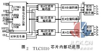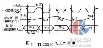 图3为TLC5510的采样时序图,TLC5510是以流水线的工作方式进行工作。当第一个时钟周期下降沿到来时,模拟输入电压将被采样到高比较器块和低比较器块,高比较器块在第二个时钟周期的上升沿的最后确定高位数据;同时,低基准电压产生与高位数据相应的电压。低比较块在第三个时钟周期的上升沿的最后确定低位数据。高位数据和低位数据在第四个时钟周期的上升沿进行组合。这样,采样转换结果的输出却在2.5个CLK周期后送到内部数据总线上。此时如果输出使能OE有效,转换后的8位数据就被存储到RAM 缓冲器中。