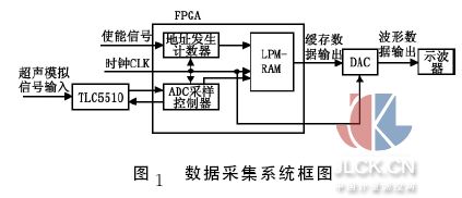 数据采集系统中的控制逻辑单元采用ALTERA公司的EP1C3T144芯片,内部的A/D采样控制器控制A/DC芯片采集超声检测模拟信号,将A/D转换好的8位数据送到FPGA 内部定制好的RAM 存储器中存储。ADC芯片采用美国德州仪器(TI)公司的TLC5510,转换速率最高可达到50MSPS,换电压量程为0.6V~2.6V。缓存选用单端口RAM 存储器,在" MegaWizardPlug-InManager" 内部定制,RAM 的数据宽度和ADC的输出数据宽度要一致,当RAM 存储器中完成一个至数个周期的被测信号采样后,在地址发生器的地址扫描下,将存于RAM 中的数据通过DAC的输出端进入示波器,完成对FPGA工作状态的实时观测和调试,从而可以准确地验证整个传输过程中数据的正确性和时序性是否满足设计需求。试验系统中模块所需的时钟由全局时钟CLK直接提供,使能信号由配置的试验箱上的按键Key1控制。系统结构框图如图1所示。