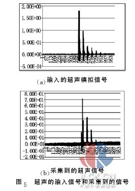 图5为采样前输入超声信号波形和采样后的超声信号波形图。通过对比采样前后的超声波形可以发现,输入超声信号能看到很多次底波,而采样后的信号只能看到二次底波和正的幅值。这是因为超声信号里含有很多噪声信号,采样过程中底波信号的电压比较小时会被噪声信号覆盖,而且示波器本身也有很多噪声信号,当输入的超声信号的电压很小时,也会把超声信号覆盖,且由A/D模块的输入电压范围决定系统只能采集0.6V~2.6V 之间的超声信号波形。但该数据采集系统实现了超声信号的高速采样和缓存过程,将超声信号转换为数字信号处理,可以提高对缺陷定位、定量的精度。