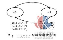根据采样时序,用状态机来描述采样控制过程。图4所示为TLC5510采样控制状态图,在状态st0,给A/D一个采样时钟ADck的上升沿,同时锁存A/D的输出;在状态st1。给出采样控制模块数据输出锁存信号。A/D采样控制器的输出共有4个信号:ADck提供采样时钟;ADoe为TLC5510的输出使能,一直有效;data为采样数据输出;dclk用来同步data的输出,作为下一级的data锁存信号。