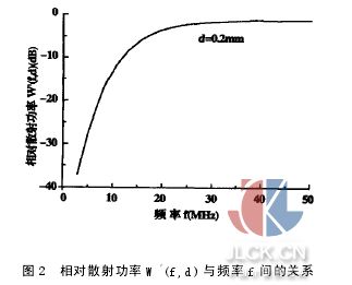 钢中球孔(以直径d=0.2 mm为例)的相对散射功率W′(f,d) =W(f,d)I0随频率变化的理论计算结果如图2所示。