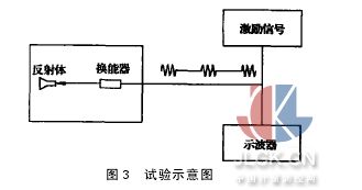 试验是以反射式水浸法进行的(如图3所示),不连续性为一圆锥体,反射面为圆形端面。采用连续正弦信号经斩波后得到的准正弦波激励,用示波器接收,CRT能识别的最小显示为2 mv(以满屏为基准即为-34 dB)。试验时,通过不断改变端面直径,找出在示波器上刚能显示和识别回波信号时的最小直径dmin。