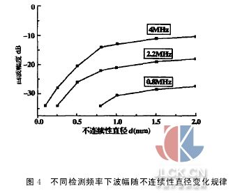 以不同检测频率(f=4,2.2和0.8 MHz)进行试验,不同检测频率下回波幅度随不连续性直径的变化规律见图4所示,不同条件下能探测到反射体的最小直径dmin为: