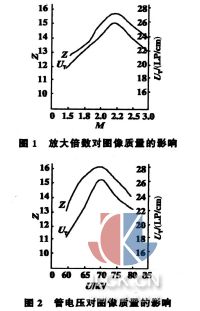 在试验中,首先使用滤板和光栅对散射线进行屏蔽,所以散射线屏蔽可视为固定参数,只针对其它四个参数分别进行试验。其中,放大倍数的影响试验选择焦距F=1000mm ,管电压U=70kV ,管电流I= 2mA ;管电压的影响试验选择焦距F=1000mm ,放大倍数M=2.2 ,管电流I=2mA ;管电流的影响试验选择放大倍数M= 2.2 ,焦距F=1000mm ,管电压U= 70kV ;焦距的影响试验选择放大倍数M= 2.2 ,管电流I= 2mA ,管电压U=70kV。试验用工件采用某卫星钛合金高压气瓶赤道焊缝,透照厚度2.3mm,单面自动氩弧焊。用分辨率测试卡和透度计分别测试不同数值下的图像分辨率UT和像质指数Z。试验结果见图1~图4。