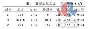 采用亚东水泥股份有限公司生产的P.O42.5水泥;湖北巴河中砂;粗集料采用阳新碎石,最大粒径为20 mm;采用阳逻Ⅰ级粉煤灰;减水剂为格雷斯中国有限公司生产的高效减水剂ADVA180;试件按照GB 50504-2002制作为150 mm×150 mm×150mm的立方体。其中A、B、C分别代表粉煤灰掺量为0%、15%、30%。试件成型后在标准养护条件下养护28天。试验混凝土配合比见表1。