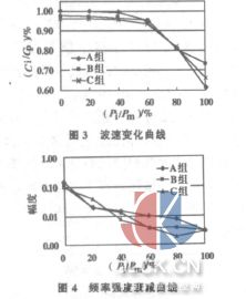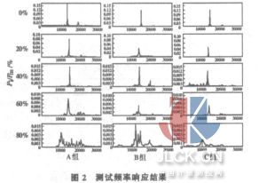 将经历过载荷作用的各组试块分别用冲击回波扫描仪进行检测。图2为所测得的频率响应结果。其中由左至右分别表示A、B、C三组不同配合比的试块。由上至下分别对应所经历的载荷为破坏载荷的0%、20%、40%、60%、80%时的测试结果。图3为所测得的波速结果,纵坐标表示波速(Ci)与基准值的比值,其中以A组中未损伤的试块所测得波速作为基准波速(CP) ,横坐标表示所加载荷(Pi)相应组试块的极限抗压强度(Pm)的比值。图4表示在经历了不同载荷后所测得的频谱峰值强度的变化趋势,图中纵轴以指数坐标的形式给出,该强度值反映了接收到的反射回波的强弱。