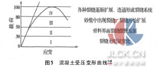 由式(2)、(3)可以看出机械应力波在材料中传播的波速、冲击回波获得的反射波的频率与材料的弹性模量、泊松比这两个力学参数有关,结合式(1)~式(3)来看,对于冲击回波测试过程中波速、频率、频谱特性的规律的研究能够反映材料的损伤程度。波速以及频谱幅值的这种变化与混凝土应力应变曲线表现出一致性(图5)。这一结果很好地验证了式(1)~式(3)所表达的混凝土内部损伤与机械应力波传播特性的关系。当混凝土经历的载荷小于混凝土最终破坏载荷的30%以下时混凝土处于弹性形变阶段,该阶段内混凝土的弹性模量损失很小,此时造成波的衰减的主要因素是混凝土中骨料与水泥浆体的界面、孔隙等,因此与应力为零时相比波速减小非常缓慢。当载荷增加到30%~60%时,骨料水泥浆、孔隙等薄弱区微裂纹的数量、长度开始增加,混凝土的变形偏离弹性阶段,弹性模量开始减小,波的衰减逐渐加快,频谱响应的强度也随之降低;当应力超过破坏载荷的60%以后,裂缝在这一阶段开始形成并迅速扩展,在超过80%以后开始形成裂缝系统,混凝土内波的反射面迅速增加,因此波的衰减速度也大大加快,同时主频附近出现其他的频率峰值(图1),表明其他反射面开始出现,反映出混凝土内部已经开始出现比较完整的大裂缝。可见冲击回波各参数变化反映了混凝土内部损伤、劣化的过程。