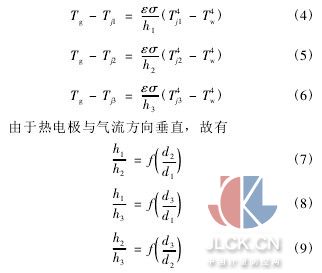 设三对热电偶的直径分别为 d1,d2,d3,相应的示值和对流换热系数分别为 Tj1,Tj2,Tj3和 h1,h2,h3。三对热偶材料相同,表面发射率均为 ε,壁温为Tw。三对热电偶均垂直于气流。采取较长的浸入长度( L/d > 20) ,使导热误差降低到可以忽略的程度。于是三对热电偶可以分别写出: