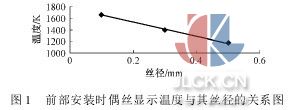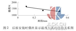 由于三偶补偿法测量不能通过计算得出较准确的辐射误差,所以需要运用零直径外推的方法对测量结果进行修正[6]。三偶温度传感器分别选用了丝径不同的三组热电偶,由测量数据可以看出,其辐射误差随着丝径变细而减小,当偶丝直径趋近于零时,其辐射误差也趋近于零。对试验数据进行线性拟合,得出( 线性曲线见图 1) :