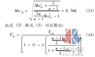由于实际测量出的马赫数 Ma前= 1. 302,温度传感器处在超音速的气流环境中,但偶丝的热结点处感受到的为激波后的气流速度,其波后马赫数为