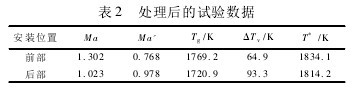 实际测量得出马赫数 Ma后= 1. 023, 参照式 13) 可计算出波后马赫数 Ma'后= 0. 978。参照式( 14) 并将 r = 0. 7,κ = 1. 433 代入方程式中可得气流总温 T*后= 1814. 2 K,其速度误差为 ΔTv后= T*后- Tg后= 93. 3 K。