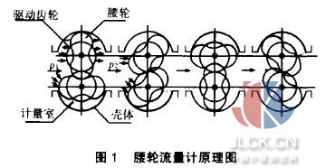 腰轮流量计属容积式流最计,当被测介质流经流量计时,流体的动压力使进出l」间形成一个压差推动腰轮旋转(见图1)。两根腰轮轴上固定一对驱动齿轮,使两个腰轮交换驱动旋转。随着腰轮的转动,液体经计量室被不断排出;腰轮与壳体组成的空间体积是一定的,每旋转一周就可排除8倍空间体积,目排出量与转数成正比,通过计量机构,将旋转的次数计算成体积流量,并利用无触点脉冲发讯器将流最信号进行远传。
