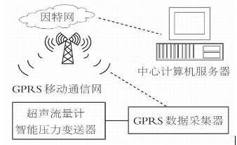 GPRS数据采集器采集存储超声流量计数据、时间、状态信息以及压力变送器数据等信息,并通过移动通信公网、互联网上传至中心计算机服务器。