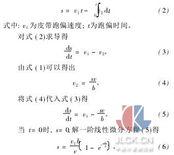 皮带在滚筒上的正常工作位置在滚筒的中间,在跑偏时总是在初始位置左右摆动。当皮带偏离正常工作位置后,检测单元便检测到了跑偏量,发出相应的电信号到伺服阀,指挥液压缸带动滚筒轴承座运动,减小偏移量。同时,检测装置也随皮带同步运动,直到检测装置运动停止,皮带纠偏完成。假设皮带在某一次跑偏中,以恒定的速度v1(常量)偏移,油缸使滚筒轴承座以速度v2(变量)跟进,则v2正比于伺服阀的输出流量qV;又因为qV正比于伺服阀的输人电流I,I又正比于皮带被纠正的距离s,则