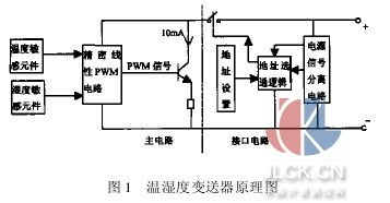 总线式温湿度变送器原理如图1所示。变送器由主电路及接口电路两部分构成。接口电路上电工作,而主电路仅在该变送器被访问时才上电工作。总线为供电电源、下传地址巡检信号及上传温湿度信号所复用。其中电源为15~30V直流电压;下传信号为电压负脉冲,其中0.5ms宽用于寻址,5ms宽用于复位;上传信号为占空比及周期复合调制的10mA电流脉冲信号。专用采集器为嵌入单片机的智能设备,通过发出下传信号选通各变送器:当发出5ms宽的复位信号时选通第一个变送器,当发出0.5ms宽寻址信号时选通下一变送器。由于变送器地址不同,故实际只有一个变送器主电路工作。当一个变送器被选通后,总线上电压稳定下来,变送器输出的电流脉冲信号被采集器检测,计算出占空比及周期,进而换算出温度及湿度。