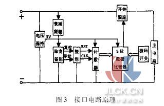 接口电路原理方框图如图3所示。低功耗稳压保持电路为CMOS数字电路提供稳定的电源。总线上的复位及寻址负脉冲经衰减限幅后通过脉宽鉴别电路分离出复位和寻址信号,再经消噪整形后控制计数器的复位和计数。当记数值与拨码开关设置的地址相同时,数据比较器输出信号将主电路接通工作。
