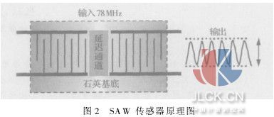 声表面波传感器的结构原理如图2所示。传感器主体是利用光刻技术在金属薄膜上蚀刻而成的两个金属叉指式换能器(IDTs),放置在压电石英基座上。输入的射频信号通过反向压电效应产生声表面波,加载到IDTs的输入端,声表面波通过延迟通道到达IDTs的输出端,声表面波信号被转换成电信号,就可以得到声波的频率和振幅信息。当传感器表面上有附着物时,传感器质量的变化就会引起声波频率和振幅的变化,这就是声表面波传感器的工作原理。