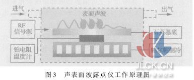 声表面波露点仪的工作原理如图3所示。当传感器表面没有露(霜)层时,声表面波没有变化;随着温度的降低,当传感器表面有露(霜)形成后,就会引起声表面波的变化。通过分析接收到的声表面波信号的频率和振幅,控制帕尔帖致冷器调节传感器表面的温度,使得水汽的冷凝速度和露(霜)层的蒸发速度达到平衡状态,在传感器表面形成一层均匀的露(霜),由铂电阻温度计即可测得气体的露点温度。