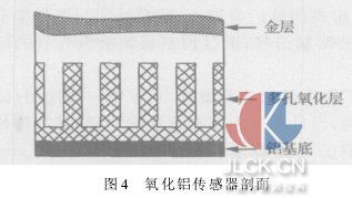下面以氧化铝湿度传感器为例说明电容式湿度传感器的基本结构和工作原理。图4为氧化铝湿度传感器的剖面图,首先将铝叉指结构经过阳极氧化处理后形成多孔氧化层,在氧化层上蒸镀很薄的金层,这样铝基底和金层之间就形成一对电极,当水汽穿过金层在多孔氧化铝层上达到平衡时,其介电常数就会发生变化从而引起电容的变化,电容量的大小可根据公式计算得到。在一定的压力和温度下,电容的变化和湿度直接相关,大多数的氧化铝传感器与露点温度呈线性响应。由于氧化铝薄膜与吸附的水汽作用会生成Al(OH)3,因此这类传感器的稳定性较差,漂移非常明显。五氧化二钽薄膜与氧化铝薄膜相比稳定性要好的多。