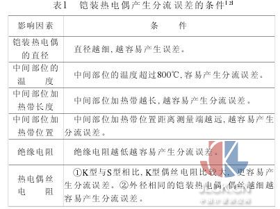分流误差的产生条件与铠装热电偶种类和直径等的关系见表1。