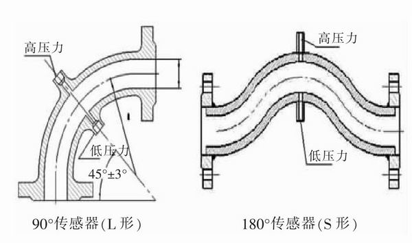 传感器主要是一个90°弯头(L形),在传感器的内外两侧45°处各钻有一个导压孔,内壁光滑,无插入件、感测件或转换件。在此基础上还有180°(S形)等型号的传感器,适合不同弯管段的应用,如图2所示。