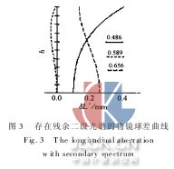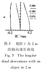 为了综合控制物镜在不同视距时的成像质量,采用ZEMAX中多重结构(Multi-configuration)设计方法,即分别取视距为无穷远和2 m来定义初始光学结构,并构建评价函数,对2个结构同时优化。图4为视距位于无穷远时的轴向球差曲线,此时全视场0.586μm波长处波差值为0・177λ(λ=0・586μm,下同);图5为视距位于2 m时的轴向球差曲线,此时全视场0.586μm波长处波差值为0・321λ。由这些结果看出,视距位于无穷远时像质指标满足像差经典公差要求;视距位于2 m时,成像质量有所下降,但还可用。