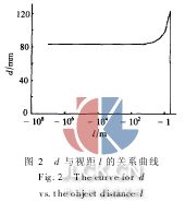 式中,l′= lf′1/(l+f′1)。图2给出了d与l的关系曲线,l为负值表示物在物镜左边。