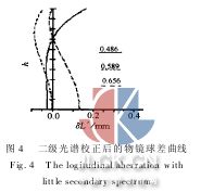 为了保证全站仪光学系统具有足够的视角放大率,物镜焦距要达到250 mm左右,因此在校正轴向色差以后,仍会残留二级光谱余量。如图3给出了设计中各色光轴向球差δL′曲线。由图3看出,仍然具有ΔLFCD′=0.2 mm的二级光谱残余像差。为了消除二级光谱色差,可以采取:(1)采用特殊的光学材料;(2)在光学系统中加一组无焦系统,以补偿整个系统的二级光谱。考虑到物镜结构的紧凑性要求,本文采用特殊的光学玻璃。图4给出了消除二级光谱后设计结果的像差曲线。由图4看出,残留的二级光谱ΔLFCD′=0.07 mm,已经可用。