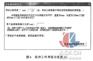 (3)条形缺陷的评定:如果选择“是”(存在条形缺陷),“条形缺陷评定”窗体会立即出现,如图6所示。首先输入单条缺陷最大长度。