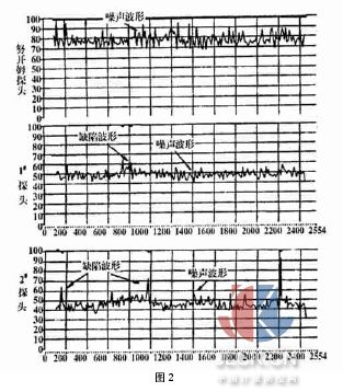 1) 38×5,钢种316L钢管调试情况。该钢管晶粒度测定为4.5~5级,比正常偏大。用努开姆公司高频探头调试样管,无法发现样管中人工缺陷回波,探伤波形杂乱;用大平公司研制的1#探头调试样管,能明显显示样管中人工缺陷回波,探伤波形清晰;大平公司2#探头调试效果与1#探头相同。(见图1)。