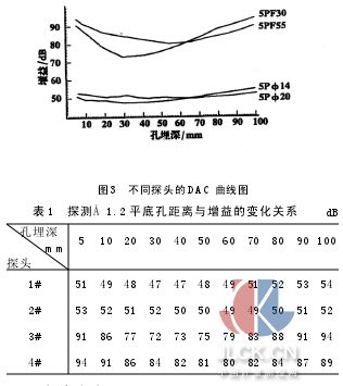 选用频率5MHz直径 14mm或频率5MHz直径 20mm直探头。图3是在Masterscan340型超声波探伤仪,用5MHz 14mm直探头(1#)、5MHz 20mm直探头(2#)、5MHz 14mm×2焦距30mm双晶组合探头(3#)、5MHz 14mm×2焦距55mm双晶组合探头(4#),在 1.2mm平底孔铝合金纵波对比试块上做的DAC距离波幅曲线图。在1#、2#探头DAC距离波幅曲线最高灵敏度基础上再增加20dB,探测10mm~100mm范围内纵波对比试块