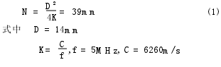 探伤起始灵敏度以 1.2mm平底孔为基准,再加12dB,探测疏松缺陷试样,用排除法、比较法,辨别疏松缺陷。通过试验,1#纵波直探头探测铝合金厚板疏松缺陷效果比较好,在探测范围内提高灵敏度12dB无杂波。在10mm~100mm探测范围内灵敏度变化梯度不如双晶组合探头大,与 20mm直探头相比上盲区小、近场区长度短、分辨率好。5MHz 14mm探头的近场区长度N由公式(1)得出。